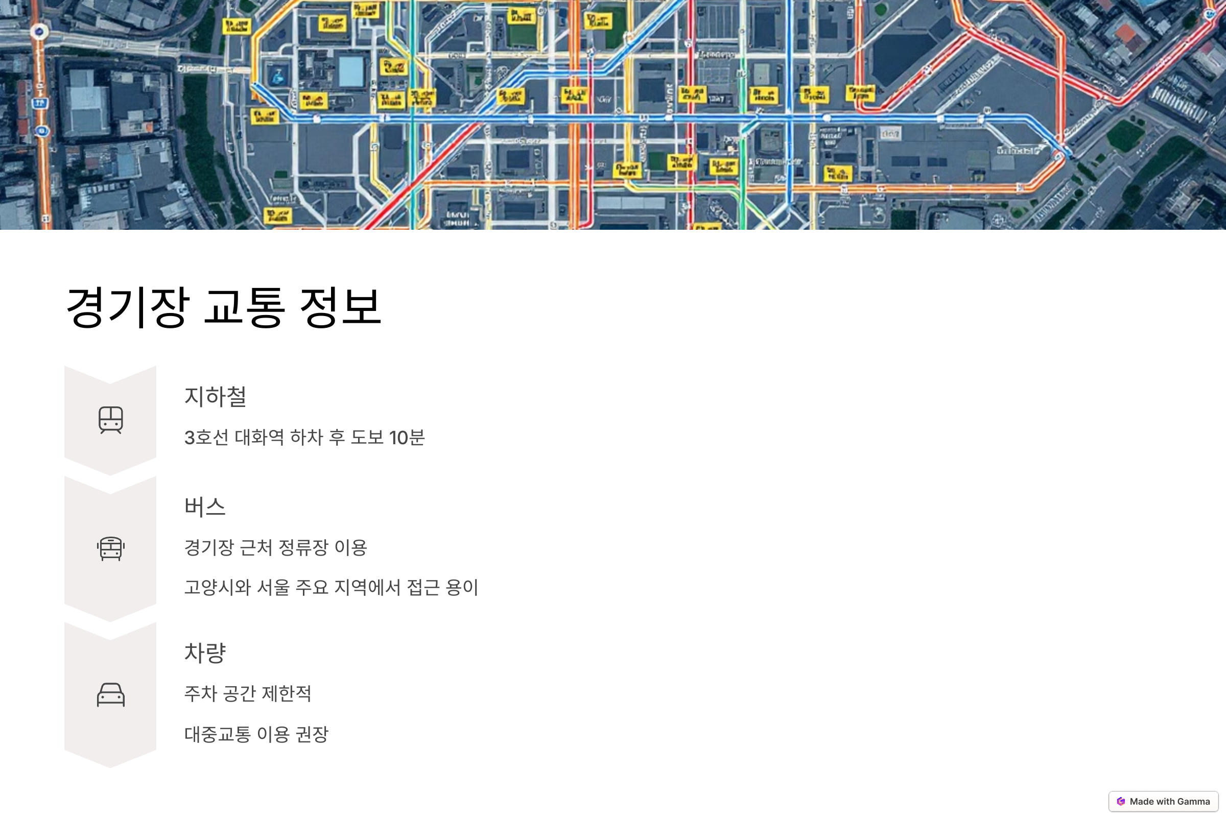 - 버스: 경기장 근처에 버스 정류장이 있어, 고양시와 서울 주요 지역에서 접근이 용이함