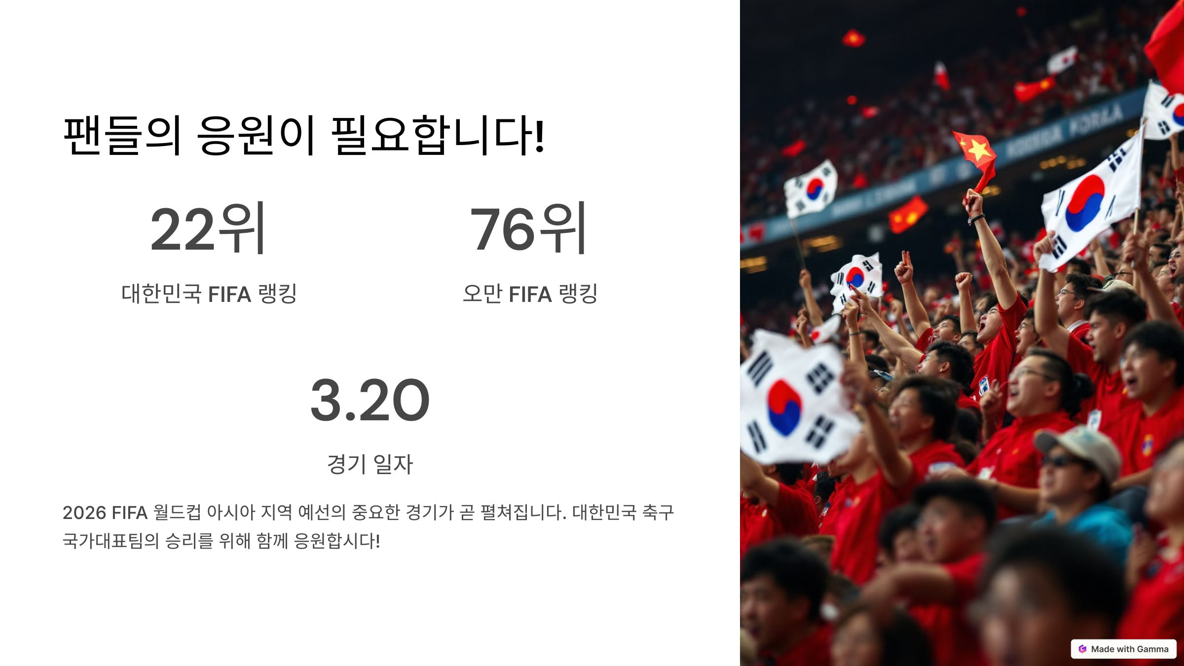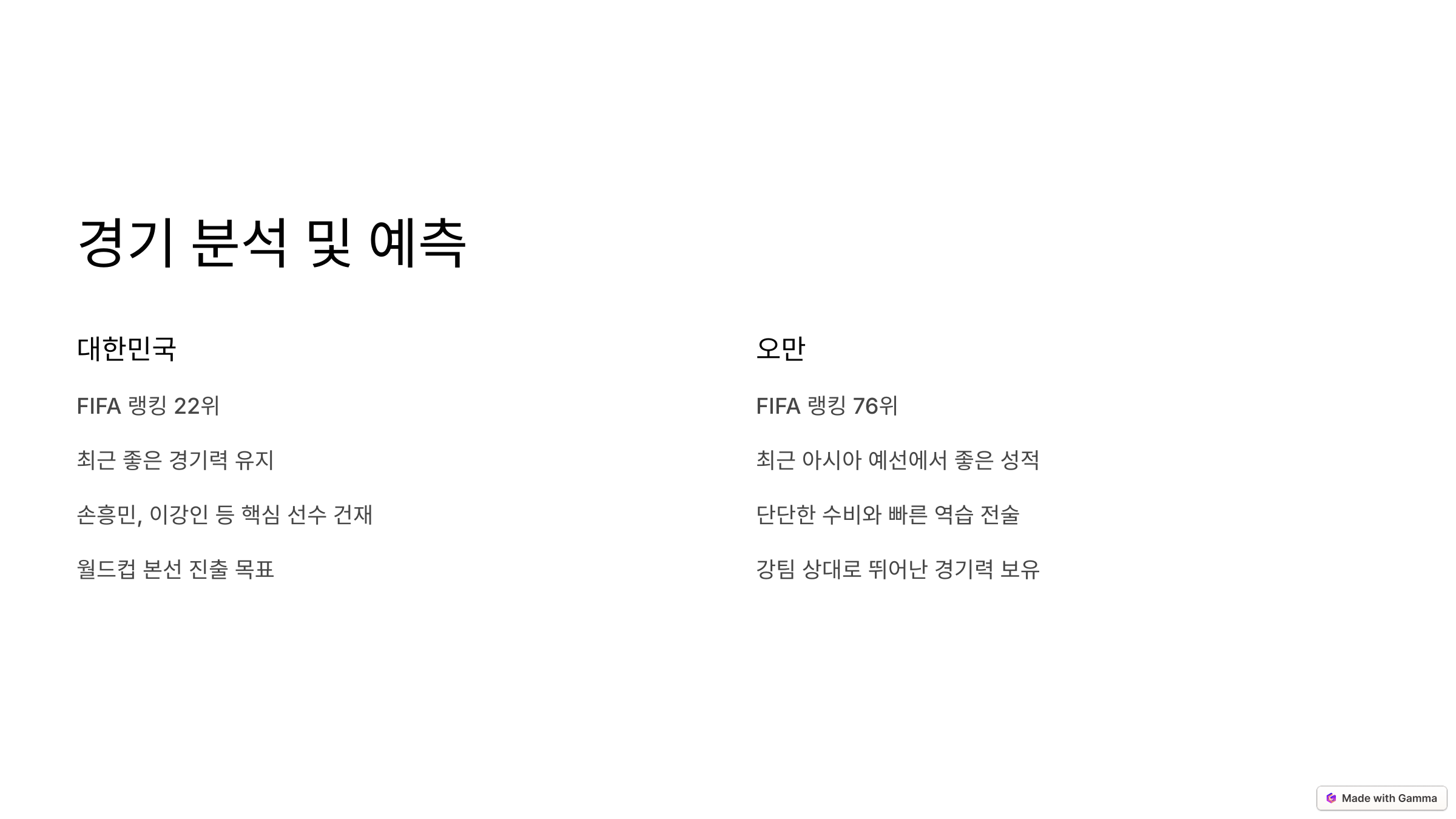 이번 경기는 대한민국에게 중요한 승점 확보의 기회이며, 오만에게는 또 다른 기적을 일으킬 수 있는 기회입니다. 대한민국이 승리를 거두기 위해서는 정확한 패스와 빠른 전개, 그리고 골 결정력이 중요할 것입니다.